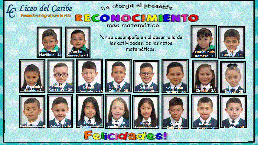 Reconocimiento a nuestros estudiantes en el mes matemático por su desempeño en el desarrollo de las actividades de los retos matemáticos.
